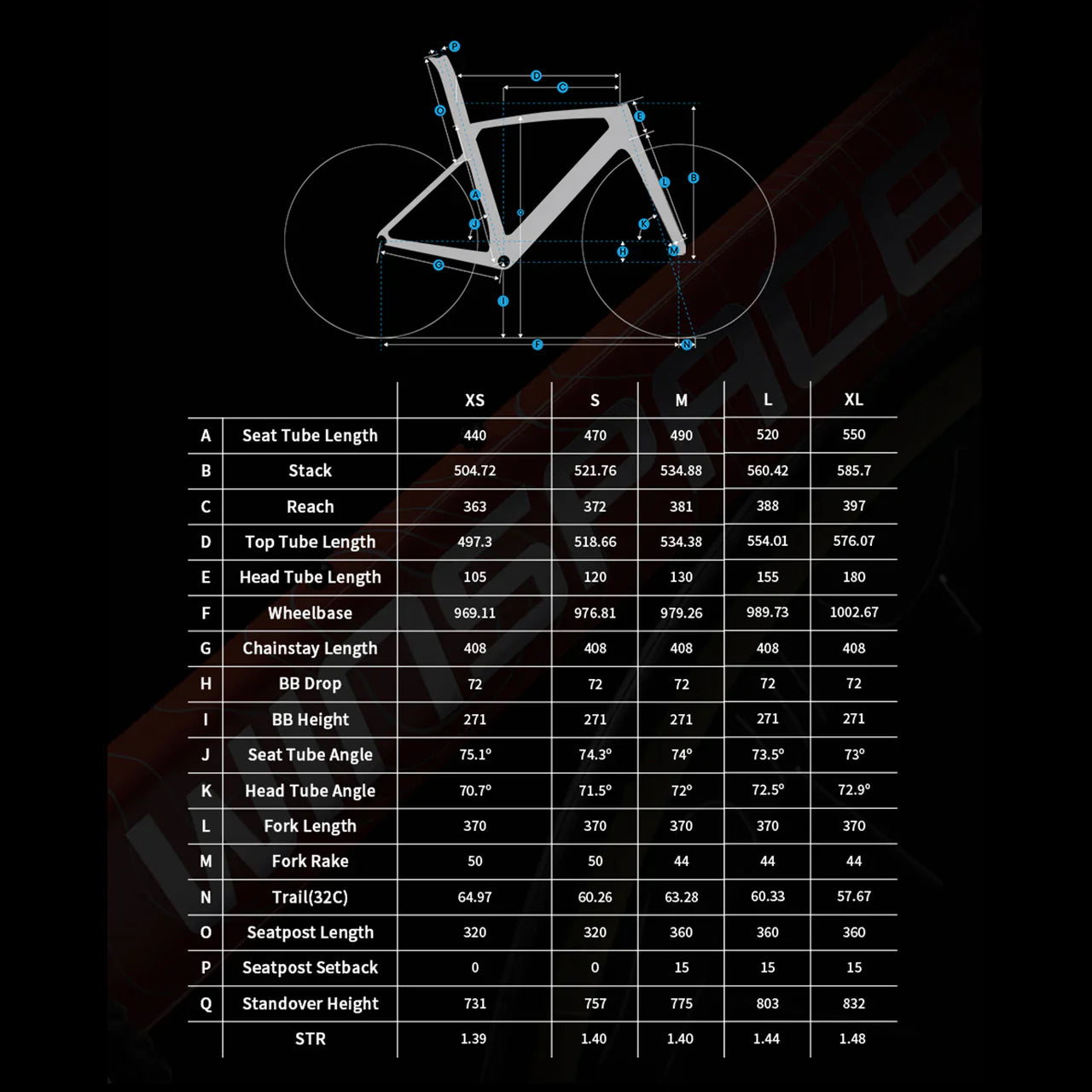 - XS (440 mm), S (470 mm), M (490 mm), L (520 mm), XL (550 mm)
